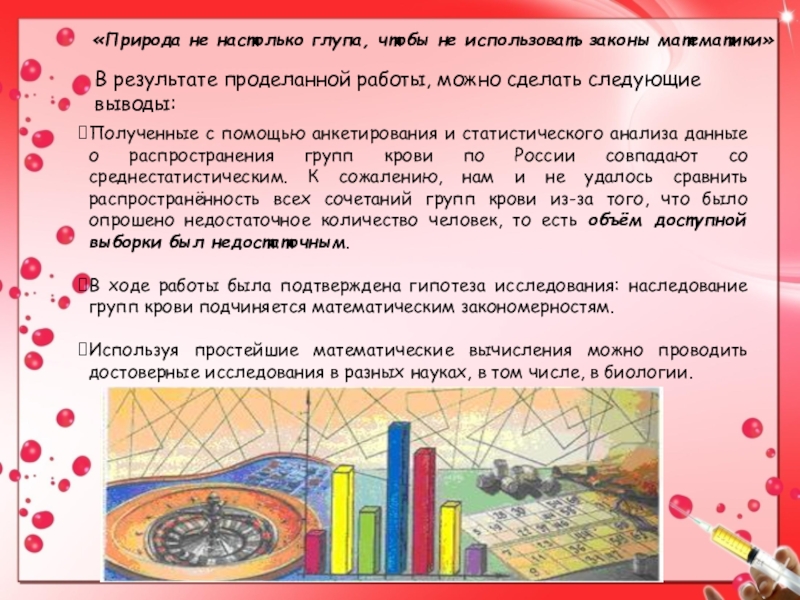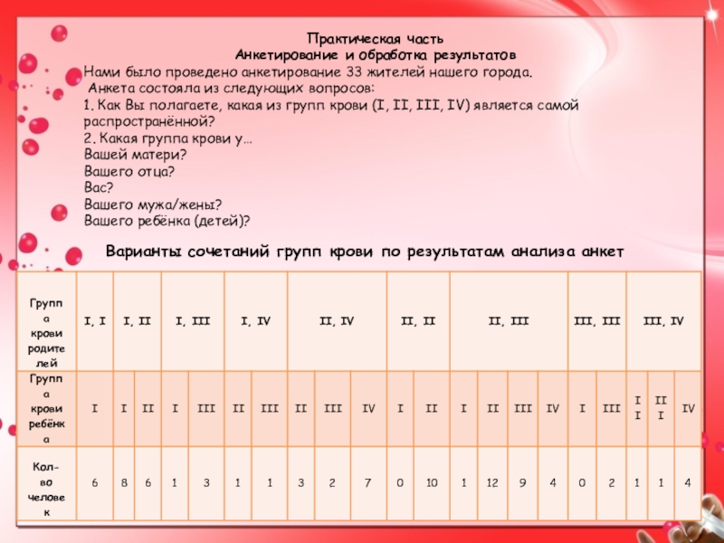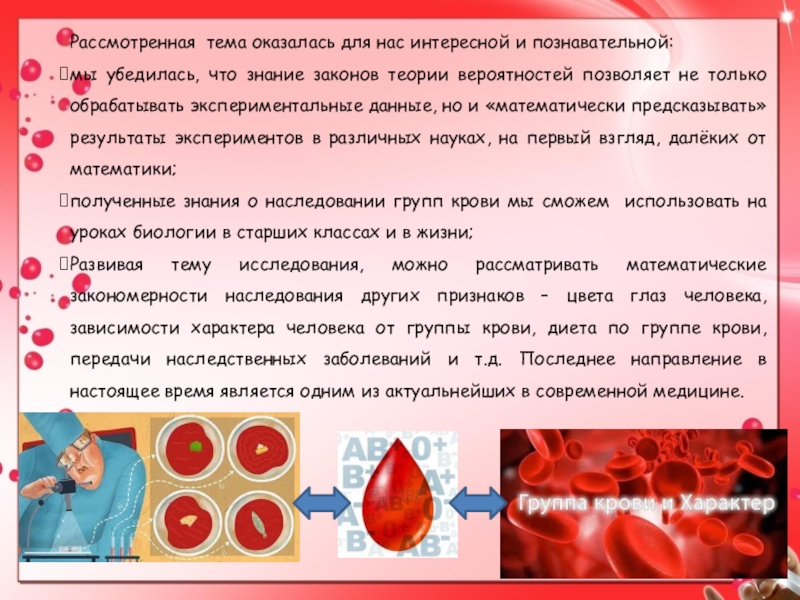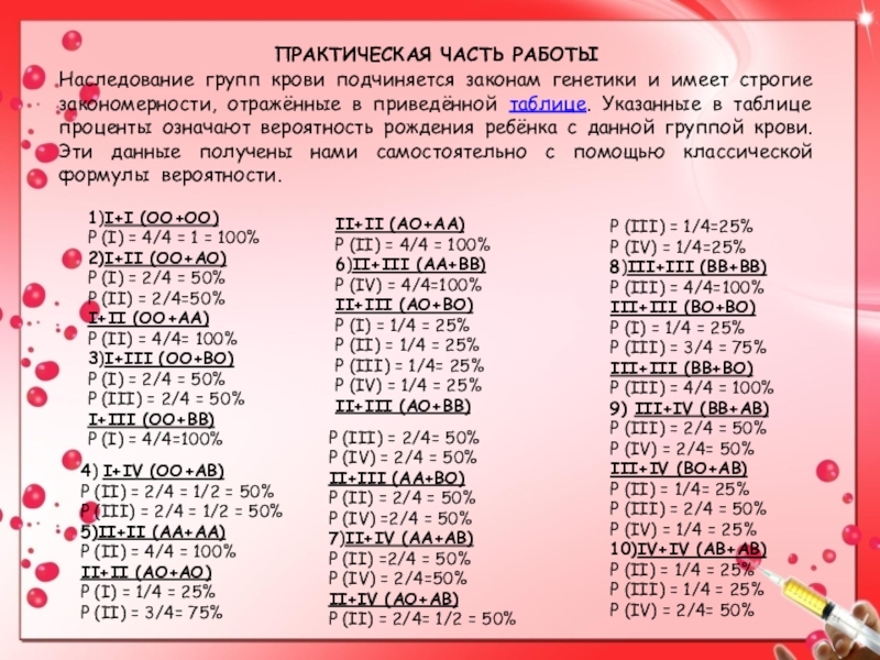 Гипотеза: Наследование групп крови подчиняется определённым математическим закономерностям: данные о наследовании групп крови, полученные в результате опроса людей, практически совпадают с данными, полученными в результате математических вычислений.