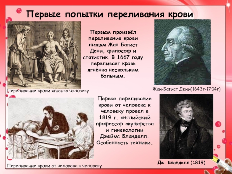 Первое переливание крови от человека к человеку провел в 1819 г. английский профессор акушерства и гинекологии Джеймс Бланделл. Особенность техники.