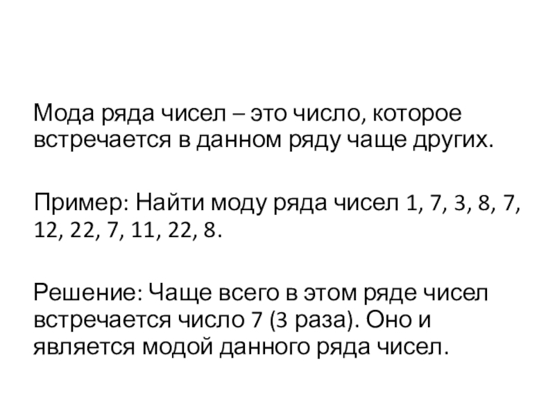Решение: Чаще всего в этом ряде чисел встречается число 7 (3 раза). Оно и является модой данного ряда чисел.