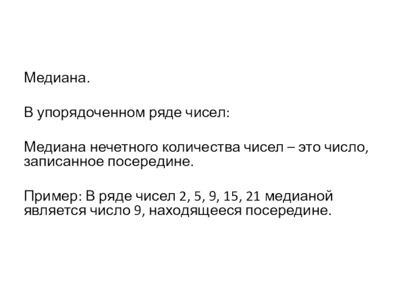 Пример: В ряде чисел 2, 5, 9, 15, 21 медианой является число 9, находящееся посередине.