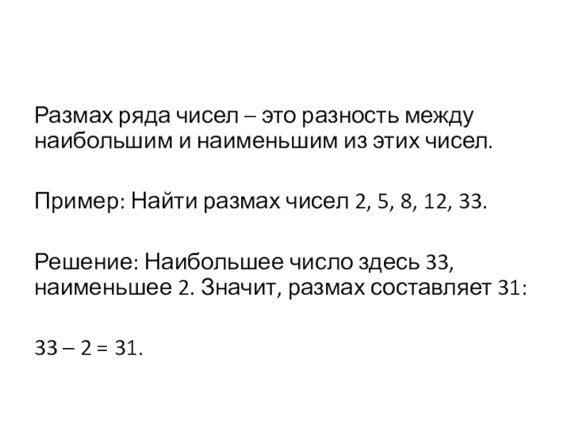 Решение: Наибольшее число здесь 33, наименьшее 2. Значит, размах составляет 31: