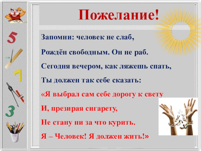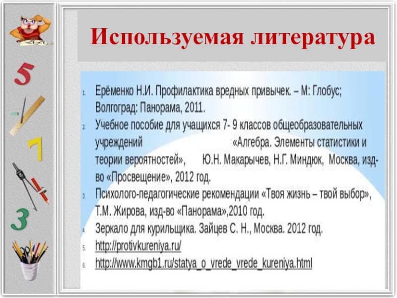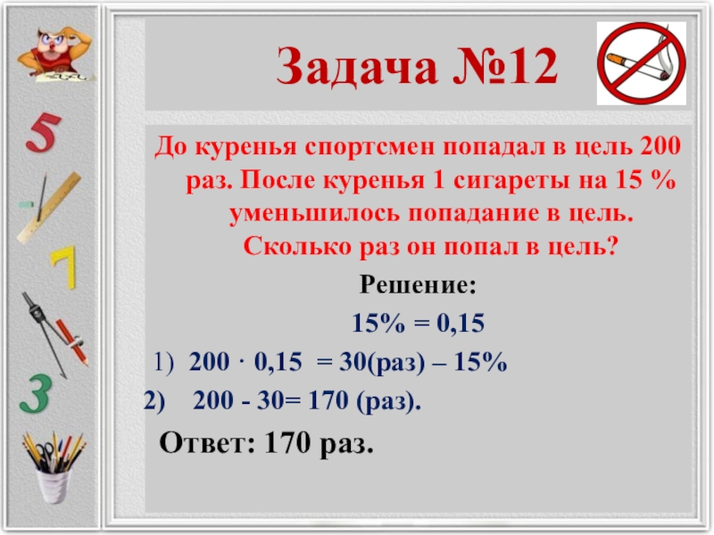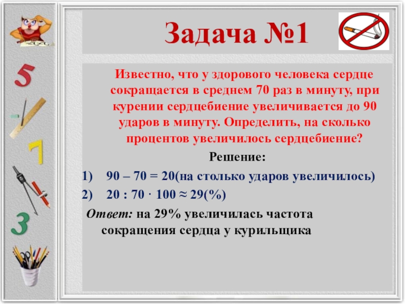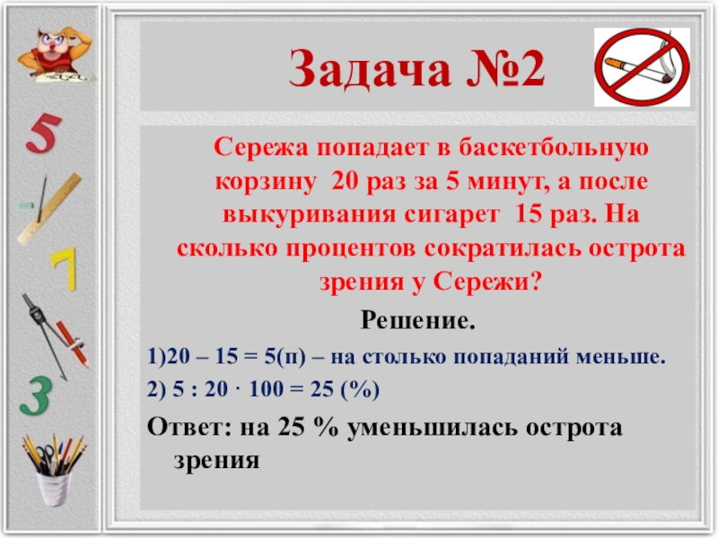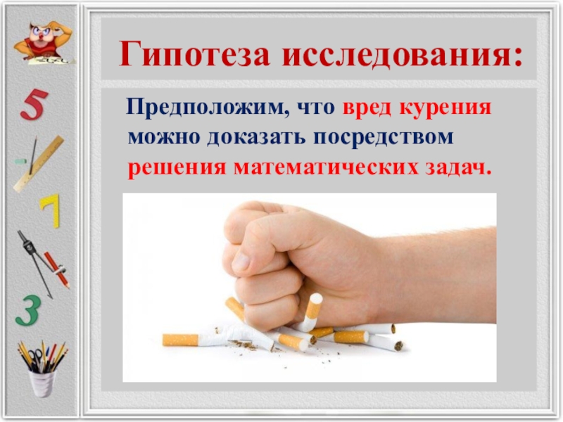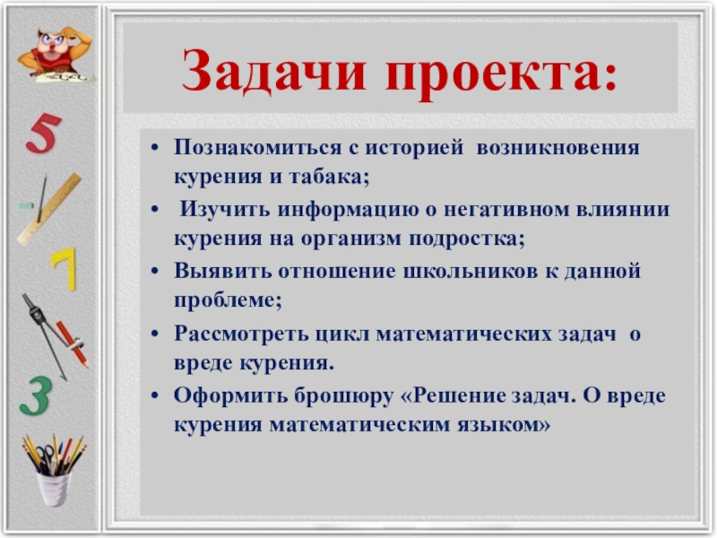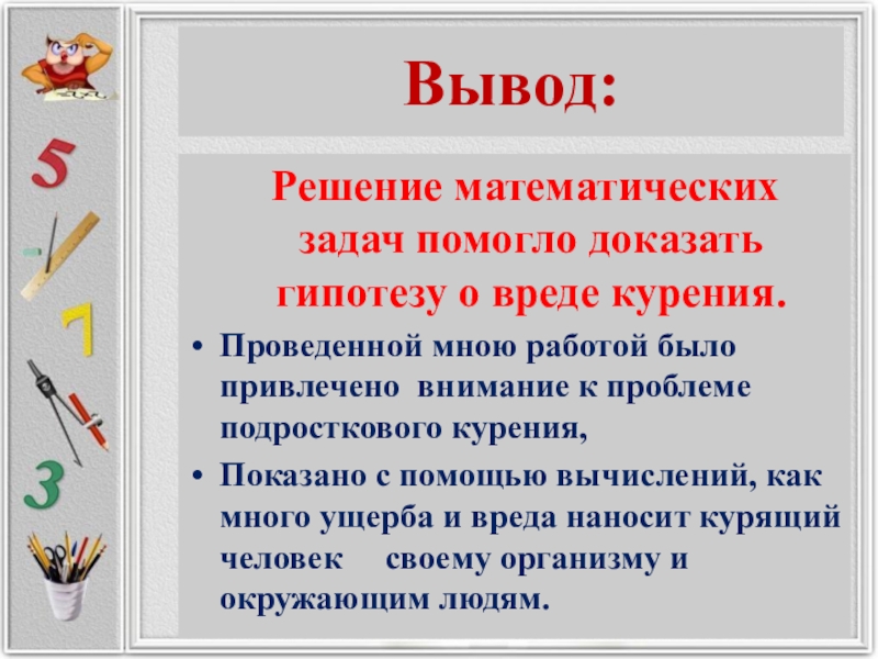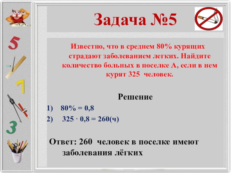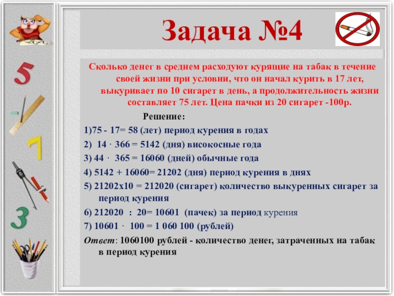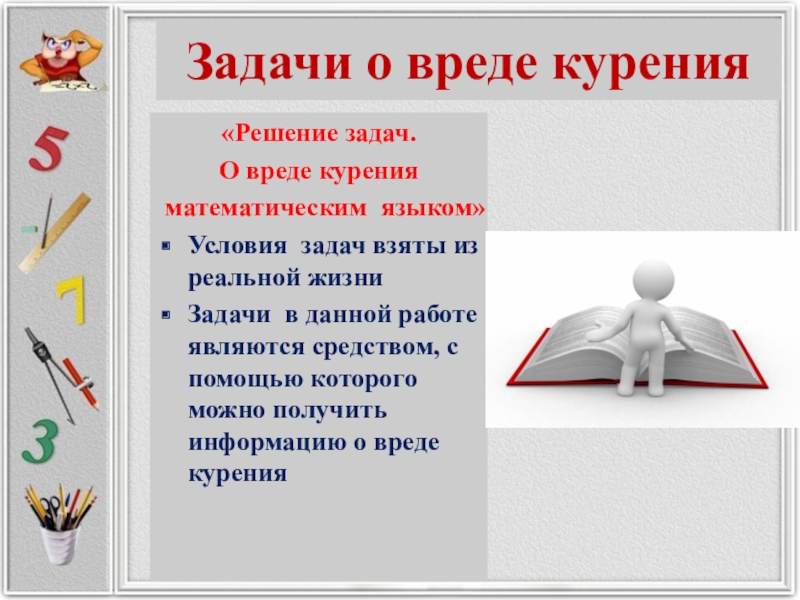 Оформить брошюру «Решение задач. О вреде курения математическим языком»