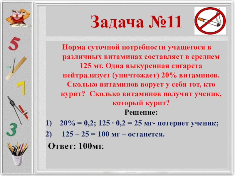 125 мг. Одна выкуренная сигарета нейтрализует (уничтожает) 20% витаминов. Сколько витаминов ворует у себя тот, кто курит? Сколько витаминов получит ученик, который курит?