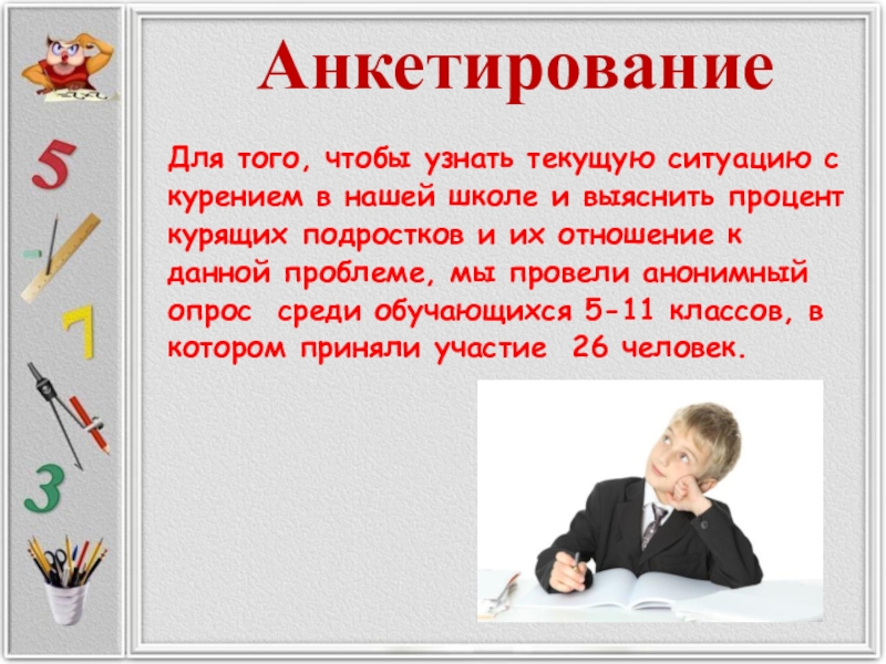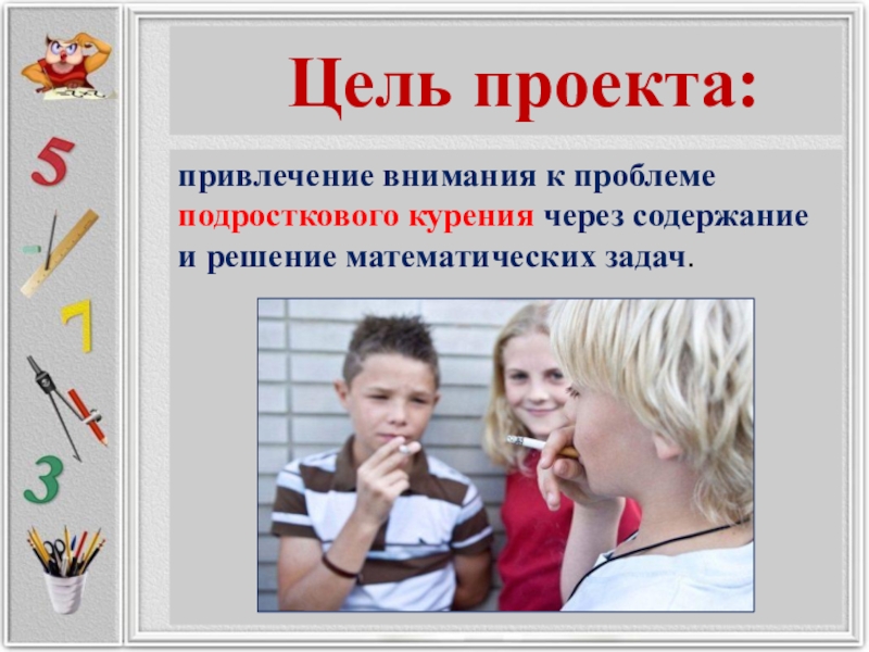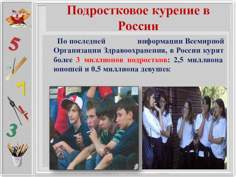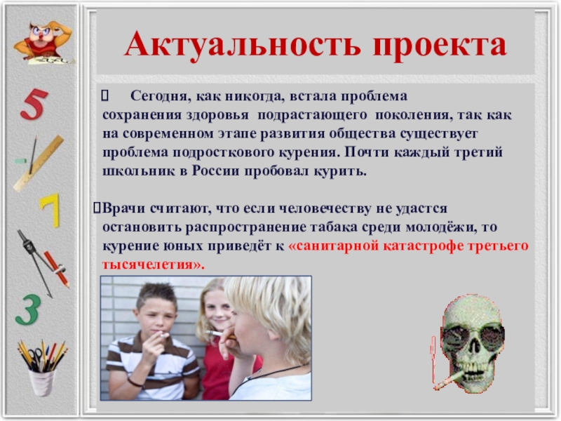 как на современном этапе развития общества существует проблема подросткового курения. Почти каждый третий школьник в России пробовал курить.
