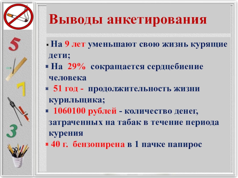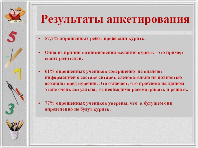Проведенной мною работой было привлечено внимание к проблеме подросткового курения,