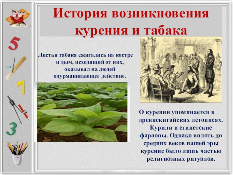 О курении упоминается в древнекитайских летописях. Курили и египетские фараоны. Однако вплоть до средних веков нашей эры курение было лишь частью религиозных ритуалов.