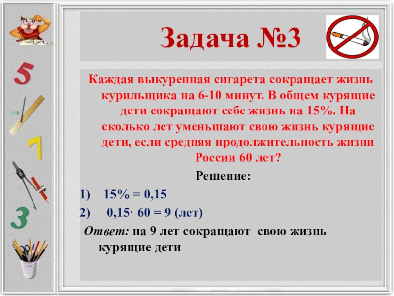 общем курящие дети сокращают себе жизнь на 15%. На сколько лет уменьшают свою жизнь курящие дети, если средняя продолжительность жизни России 60 лет?