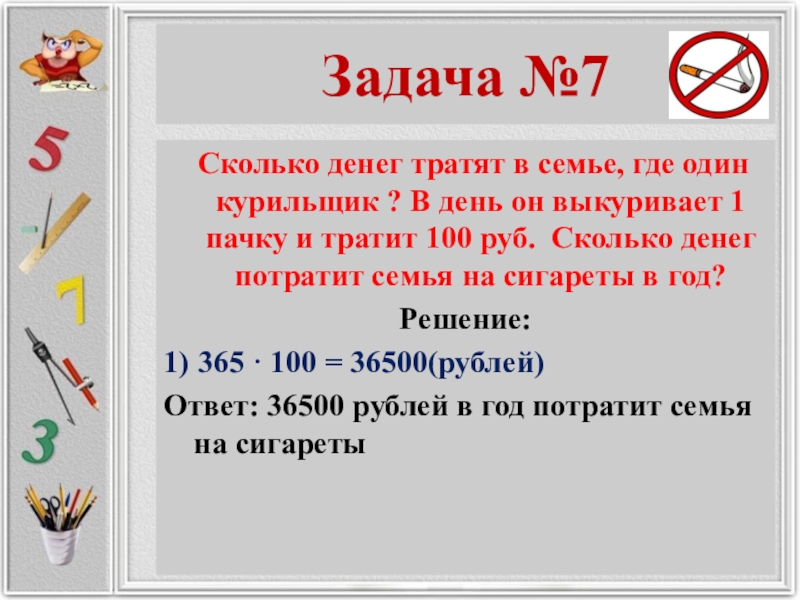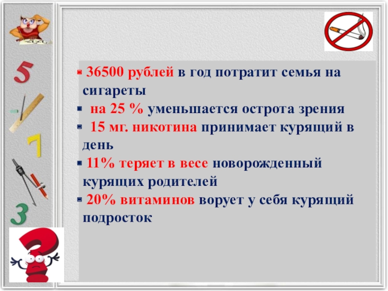Слайд 33 36500 рублей в год потратит семья на сигареты