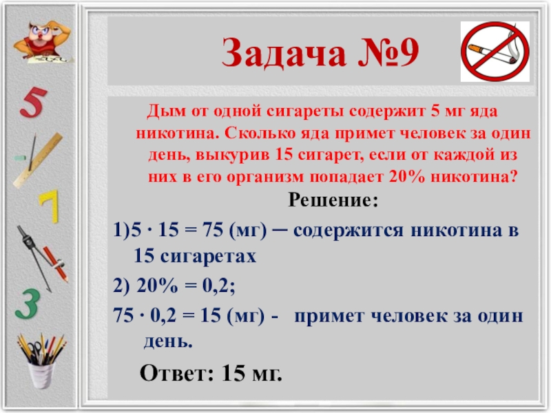 1)5 ∙ 15 = 75 (мг) ─ содержится никотина в 15 сигаретах