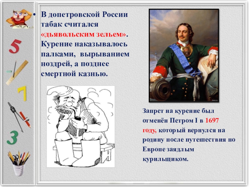 В допетровской России табак считался «дьявольским зельем». Курение наказывалось палками, вырыванием