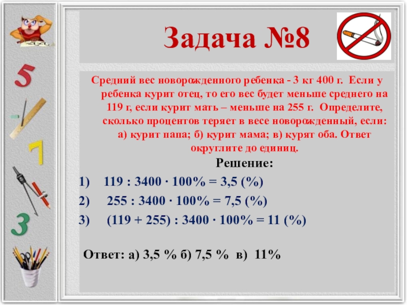 у ребенка курит отец, то его вес будет меньше среднего на 119 г, если курит мать – меньше на 255 г. Определите, сколько процентов теряет в весе новорожденный, если: а) курит папа; б) курит мама; в) курят оба. Ответ округлите до единиц.