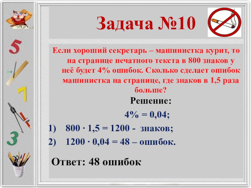 текста в 800 знаков у неё будет 4% ошибок. Сколько сделает ошибок машинистка на странице, где знаков в 1,5 раза больше?