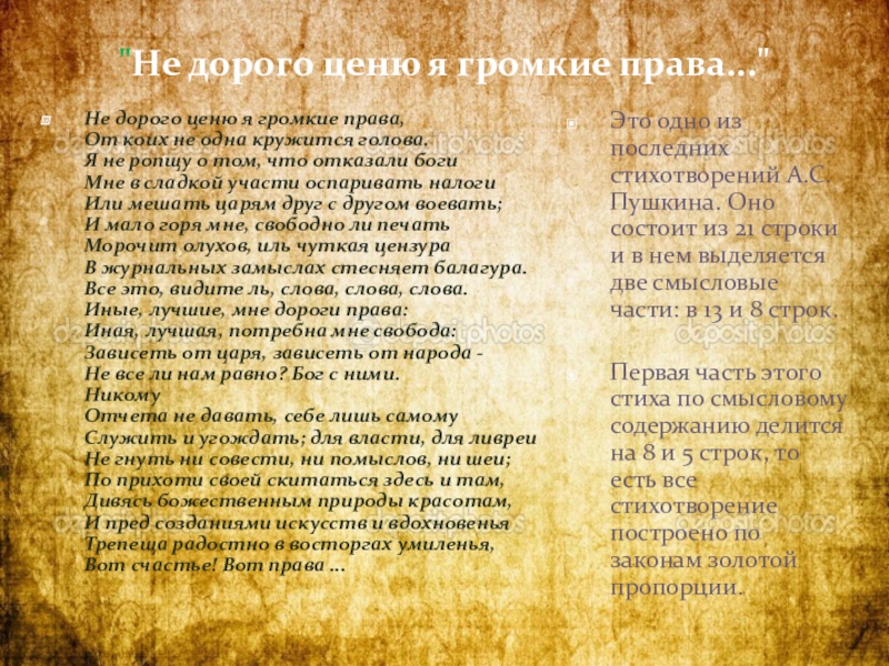 Это одно из последних стихотворений А.С.Пушкина. Оно состоит из 21 строки и в нем выделяется две смысловые части: в 13 и 8 строк.