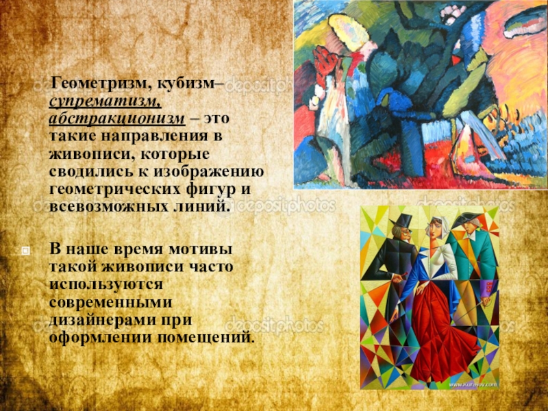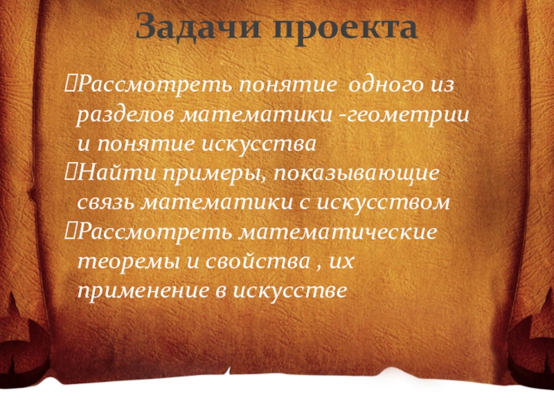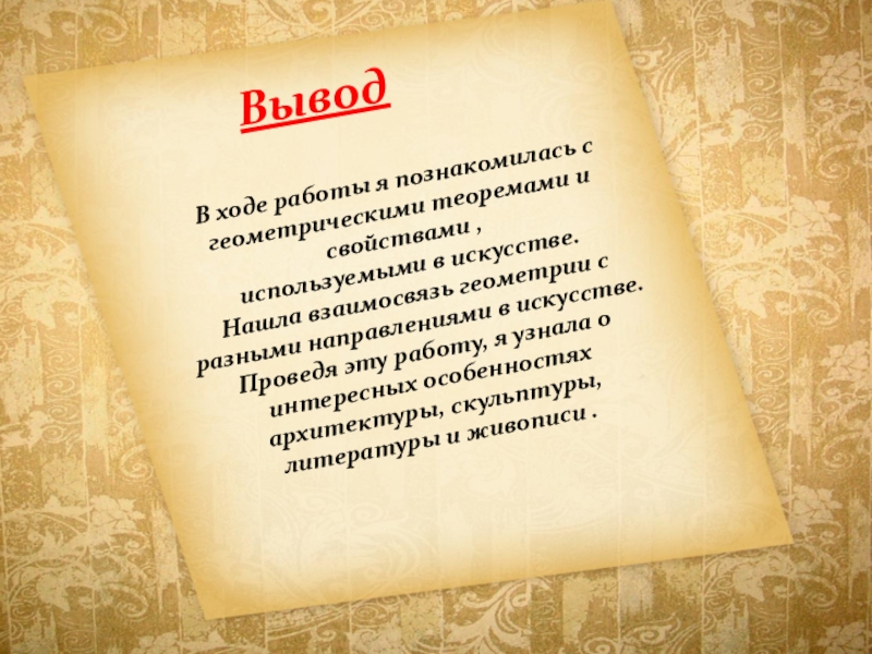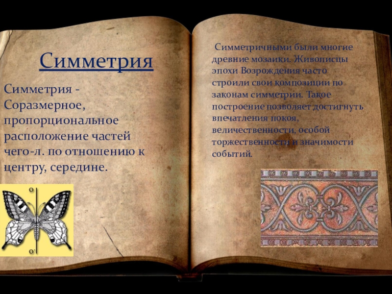 Симметричными были многие древние мозаики. Живописцы эпохи Возрождения часто строили свои композиции по законам симметрии. Такое построение позволяет достигнуть впечатления покоя, величественности, особой торжественности и значимости событий.
