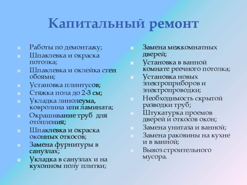 Капитальный ремонт квартиры состоит из всех ремонтно-отделочных работ, выполняемых с целью ликвидации физического износа помещений и коммуникаций в квартире, без изменения технико-экономических показателей и их функционального назначения: