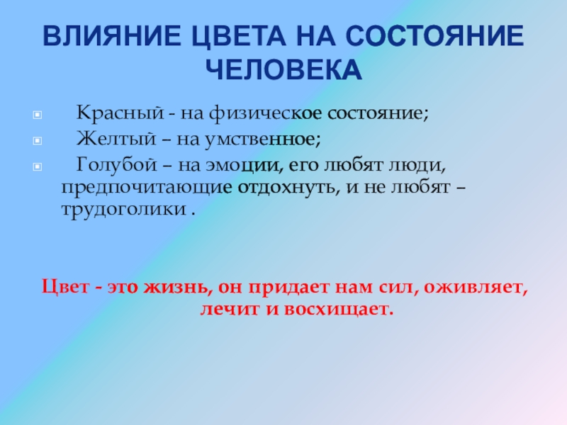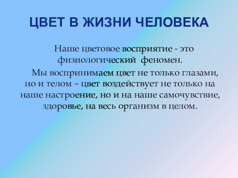 Мы воспринимаем цвет не только глазами, но и телом – цвет воздействует не только на наше настроение, но и на наше самочувствие, здоровье, на весь организм в целом.