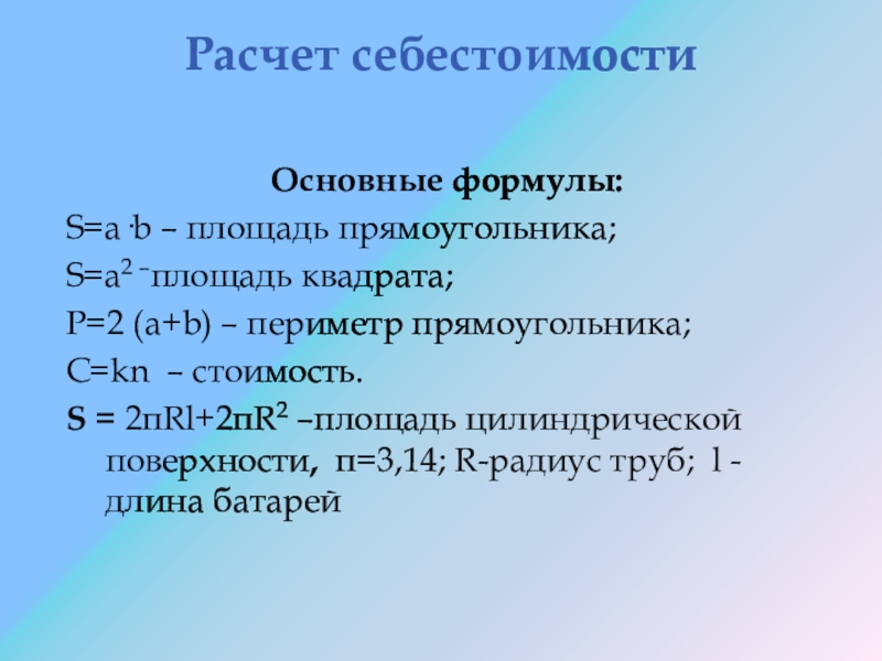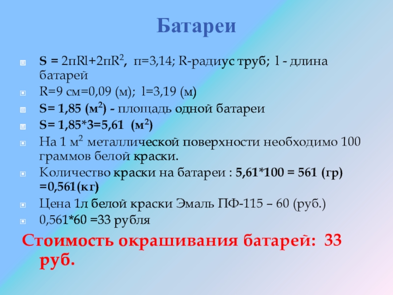 S = 2Rl+2R2, =3,14; R-радиус труб; l - длина батарей