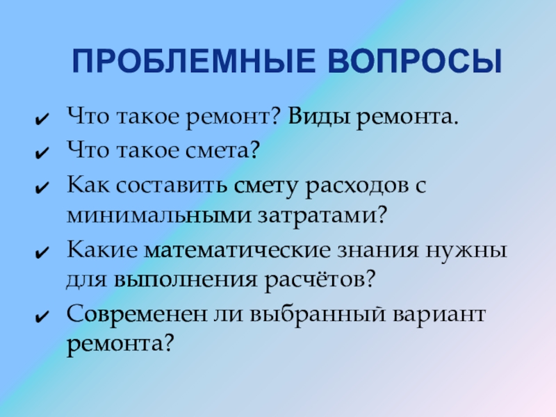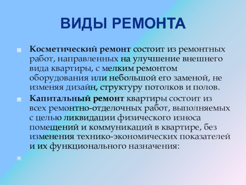 квартиры, с мелким ремонтом оборудования или небольшой его заменой, не изменяя дизайн, структуру потолков и полов.