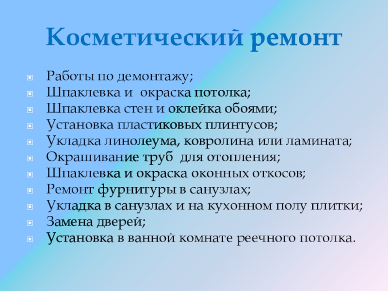 Косметический ремонт состоит из ремонтных работ, направленных на улучшение внешнего вида