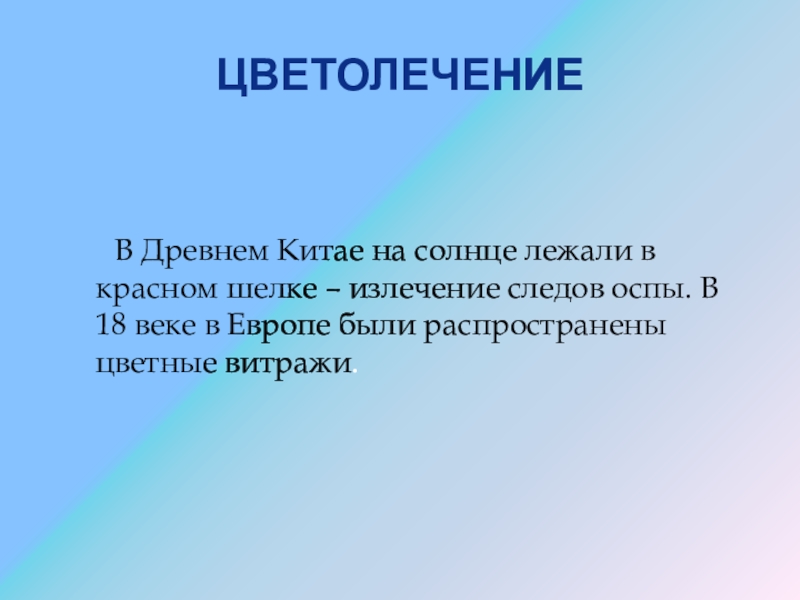 на солнце лежали в красном шелке – излечение следов оспы. В 18 веке в Европе были распространены цветные витражи.