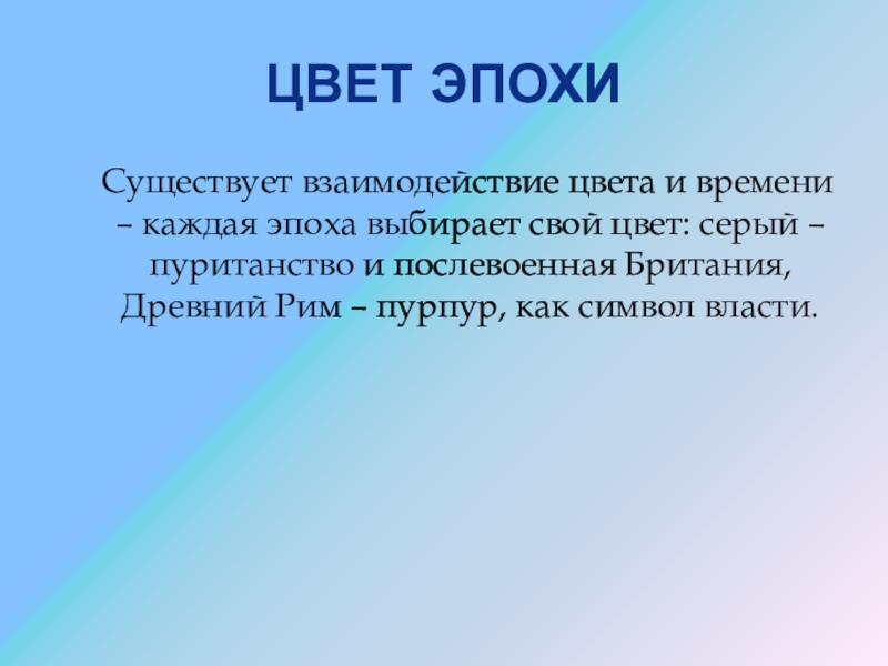 выбирает свой цвет: серый – пуританство и послевоенная Британия, Древний Рим – пурпур, как символ власти.