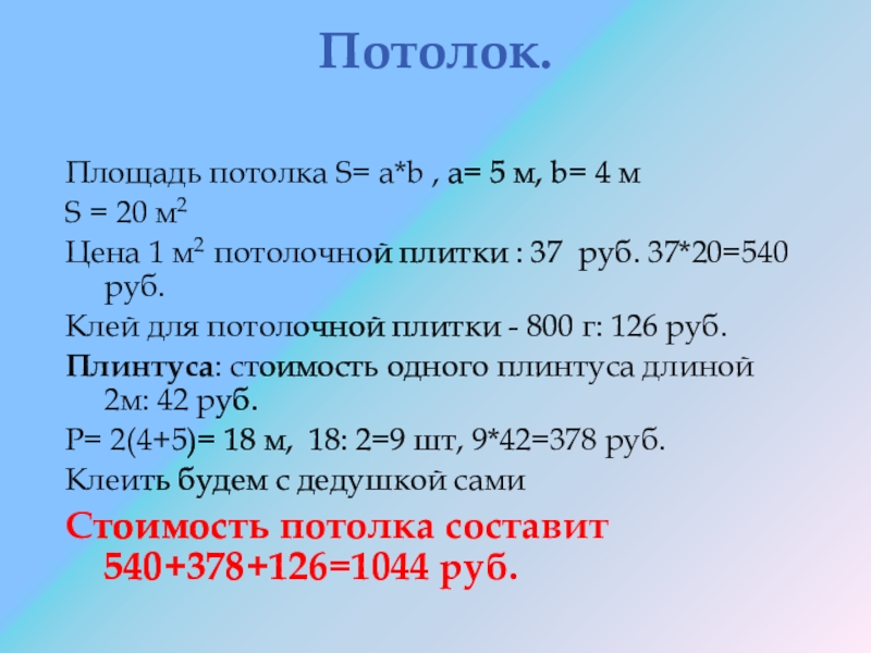 Площадь потолка S= a*b , а= 5 м, b= 4 м