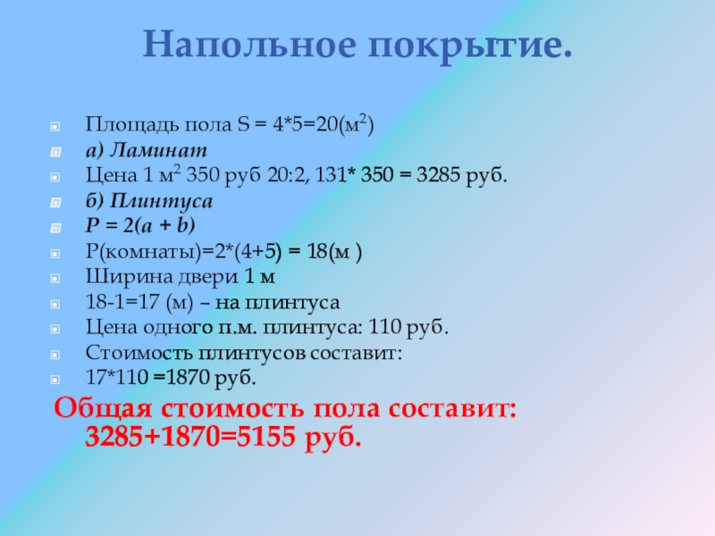 Общая стоимость пола составит: 3285+1870=5155 руб.