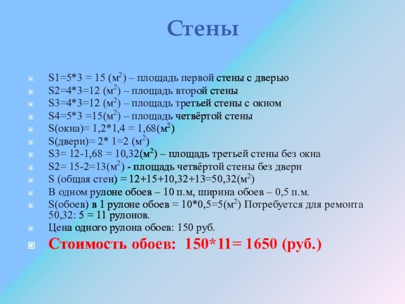 S4=5*3 =15(м2) – площадь четвёртой стены