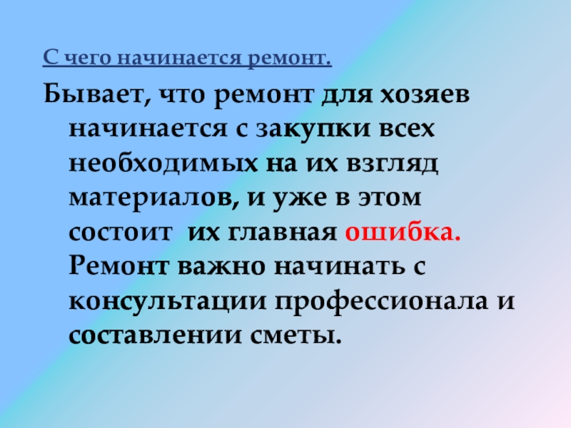 всех необходимых на их взгляд материалов, и уже в этом состоит их главная ошибка. Ремонт важно начинать с консультации профессионала и составлении сметы.
