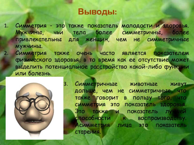 Симметричные животные живут дольше, чем не симметричные, что также говорит в пользу того, что симметрия это показатель здоровья. Это также и показатель лучшей способности к воспроизводству. Асимметрия лица это показатель старения.