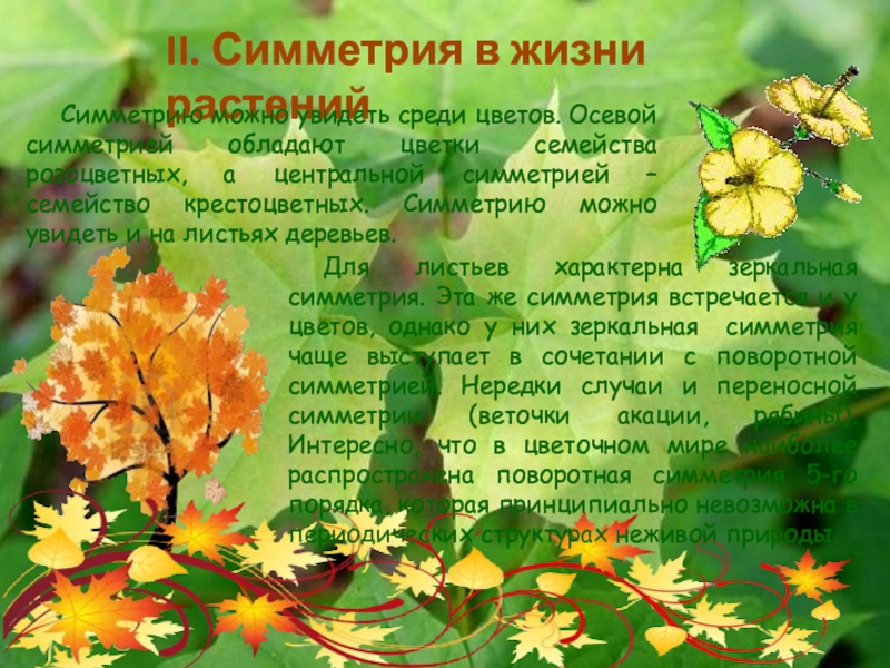 Для листьев характерна зеркальная симметрия. Эта же симметрия встречается и у цветов, однако у них зеркальная симметрия чаще выступает в сочетании с поворотной симметрией. Нередки случаи и переносной симметрии (веточки акации, рябины). Интересно, что в цветочном мире наиболее распространена поворотная симметрия 5-го порядка, которая принципиально невозможна в периодических структурах неживой природы.