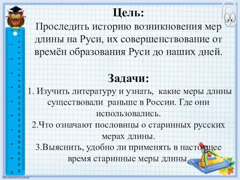 Цель: Проследить историю возникновения мер длины на Руси, их совершенствование от времён образования Руси до наших