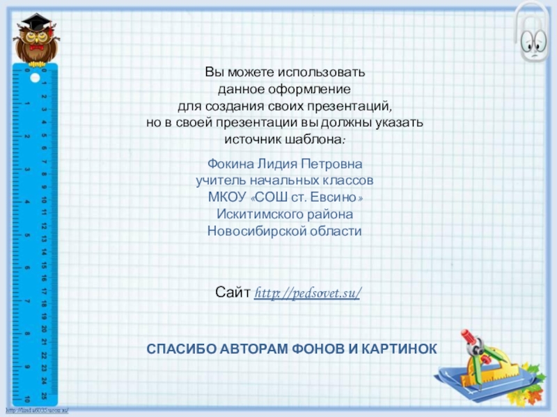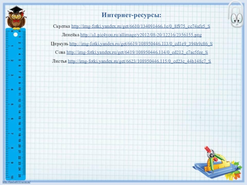 Интернет-ресурсы:Скрепка http://img-fotki.yandex.ru/get/6610/134091466.1c/0_8f975_cc74afe5_S Линейка http://s1.pic4you.ru/allimage/y2012/08-20/12216/2356155.png Циркуль http://img-fotki.yandex.ru/get/6619/108950446.113/0_cd1e9_394b9c86_S Сова http://img-fotki.yandex.ru/get/6419/108950446.114/0_cd212_c7ac5fee_S Листья http://img-fotki.yandex.ru/get/6623/108950446.115/0_cd23c_44b148c7_S