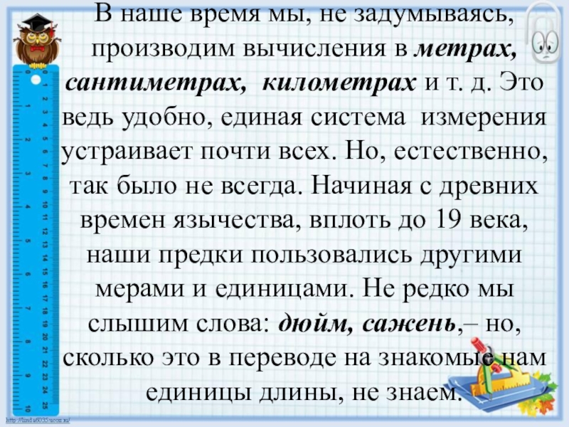 Слайд 2В наше время мы, не задумываясь, производим вычисления в метрах, сантиметрах,