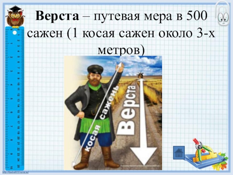 Слайд 11Верста – путевая мера в 500 сажен (1 косая сажен около