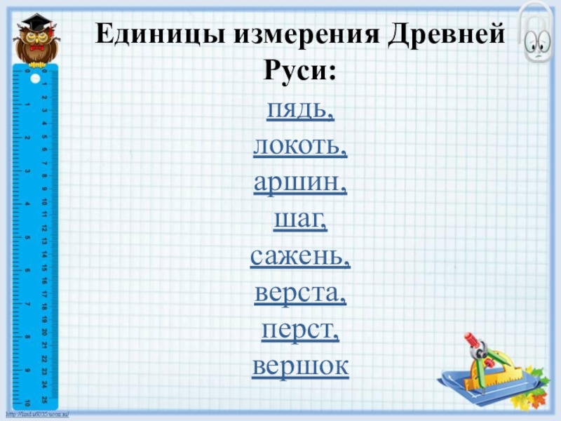 Единицы измерения Древней Руси: пядь, локоть, аршин, шаг, сажень, верста, перст, вершок