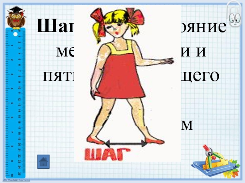 Слайд 9Шаг – это расстояние между носками и пятками шагающего человека. Длина