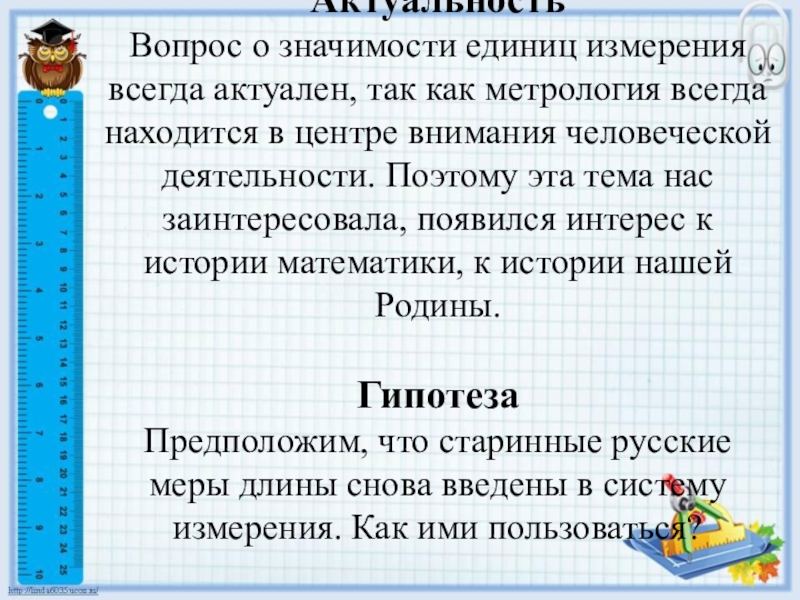 всегда находится в центре внимания человеческой деятельности. Поэтому эта тема нас заинтересовала, появился интерес к истории математики, к истории нашей Родины. Гипотеза Предположим, что старинные русские меры длины снова введены в систему измерения. Как ими пользоваться?