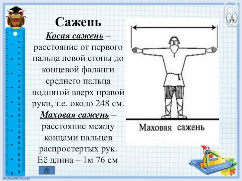 Сажень  Косая сажень – расстояние от первого пальца левой стопы до концевой фаланги среднего пальца поднятой