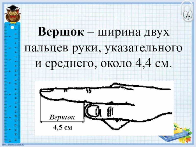 Слайд 13Вершок – ширина двух пальцев руки, указательного и среднего, около 4,4