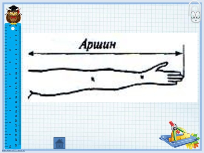 Слайд 8Аршин – это длина руки от плеча до конца среднего пальца. В