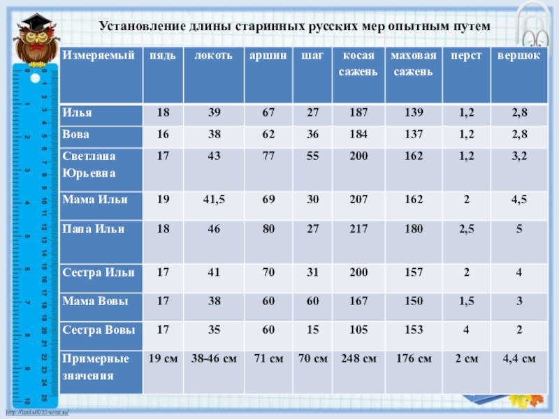километрах и т. д. Это ведь удобно, единая система измерения устраивает почти всех. Но, естественно, так было не всегда. Начиная с древних времен язычества, вплоть до 19 века, наши предки пользовались другими мерами и единицами. Не редко мы слышим слова: дюйм, сажень,– но, сколько это в переводе на знакомые нам единицы длины, не знаем.