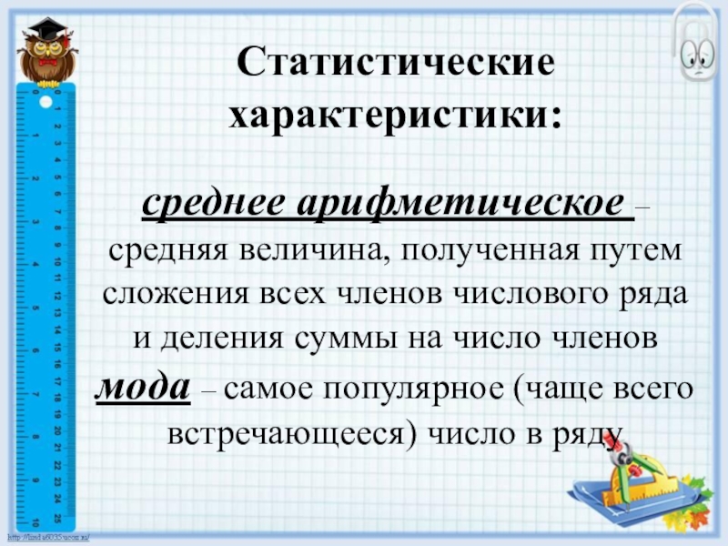 Статистические характеристики:  среднее арифметическое – средняя величина, полученная путем сложения всех членов числового ряда и деления