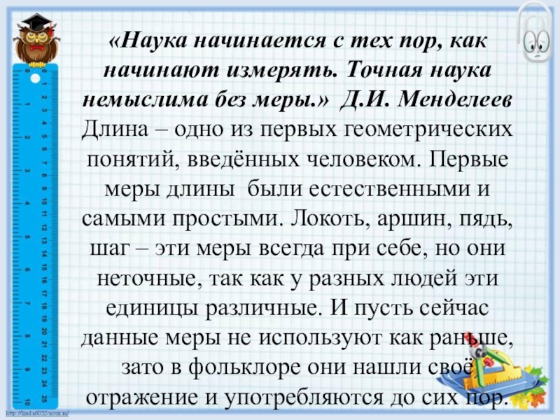 немыслима без меры.» Д.И. Менделеев Длина – одно из первых геометрических понятий, введённых человеком. Первые меры длины были естественными и самыми простыми. Локоть, аршин, пядь, шаг – эти меры всегда при себе, но они неточные, так как у разных людей эти единицы различные. И пусть сейчас данные меры не используют как раньше, зато в фольклоре они нашли своё отражение и употребляются до сих пор.