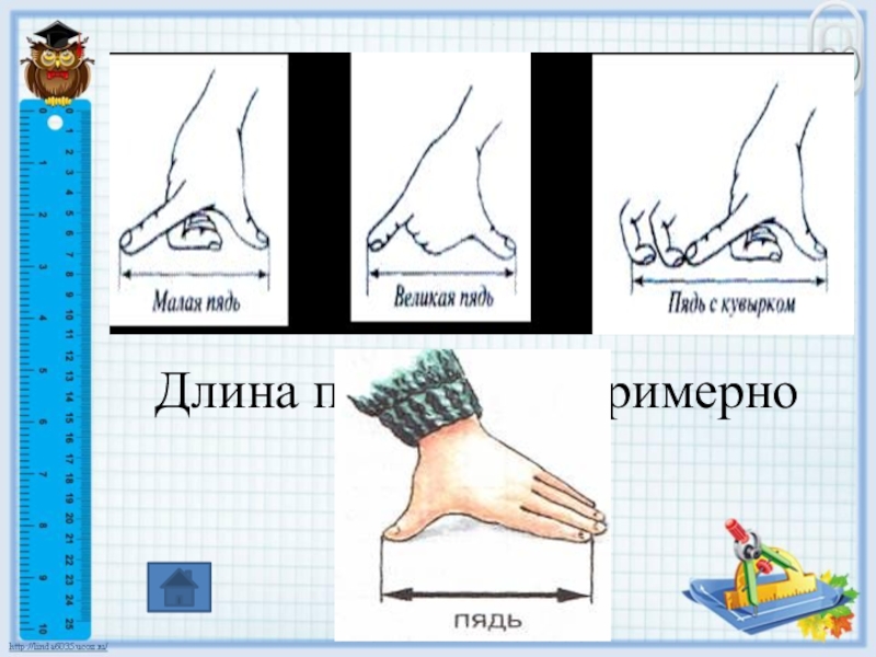 Слайд 6Пядь – это расстояние между вытянутыми пальцами руки. Длина пяди равна примерно