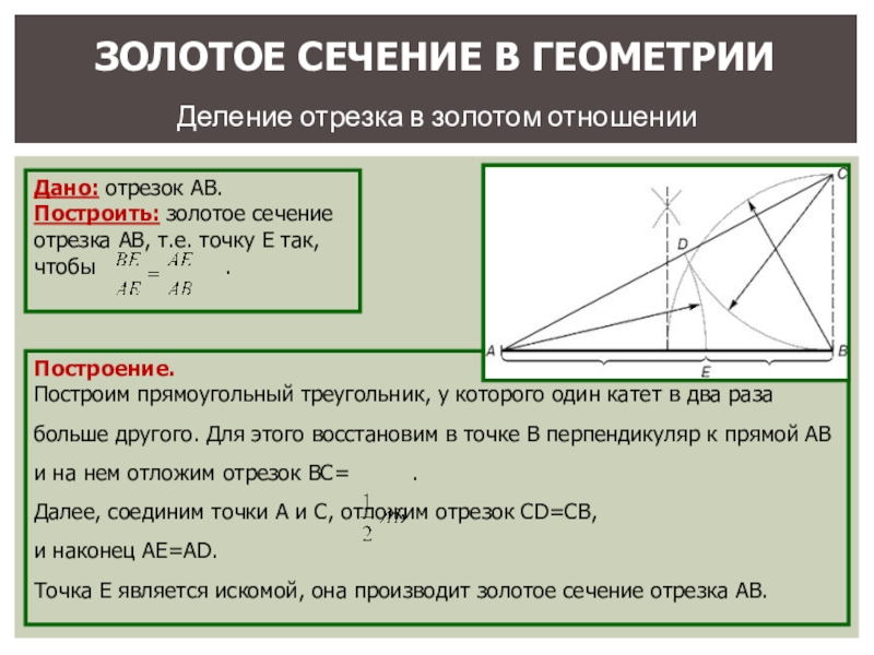 Точка Е является искомой, она производит золотое сечение отрезка АВ.