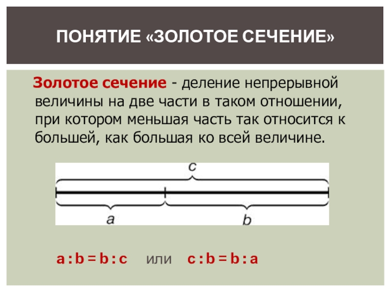 Золотое сечение - деление непрерывной величины на две части в таком отношении, при котором меньшая часть так относится к большей, как большая ко всей величине.