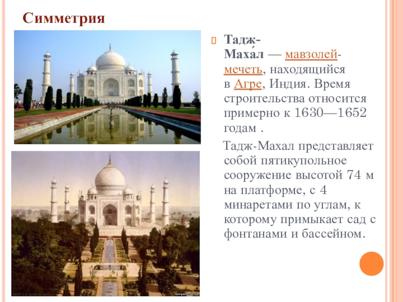 Слайд 33Тадж-Маха́л — мавзолей-мечеть, находящийся в Агре, Индия. Время строительства относится примерно к 1630—1652 годам .