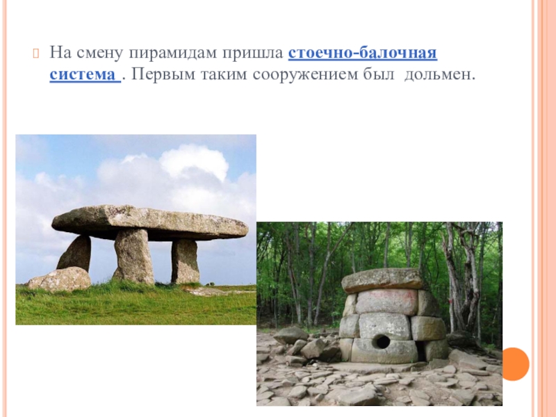 Слайд 16На смену пирамидам пришла стоечно-балочная система . Первым таким сооружением был