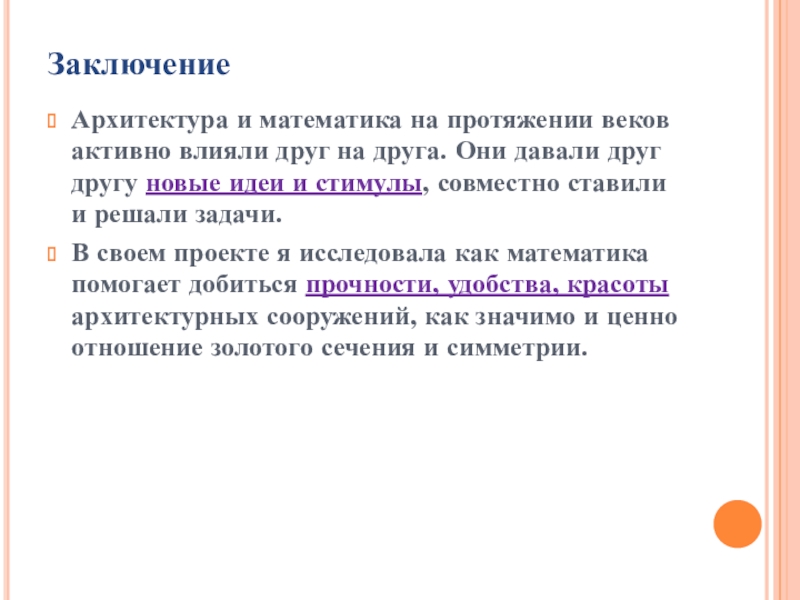 В своем проекте я исследовала как математика помогает добиться прочности, удобства, красоты архитектурных сооружений, как значимо и ценно отношение золотого сечения и симметрии.